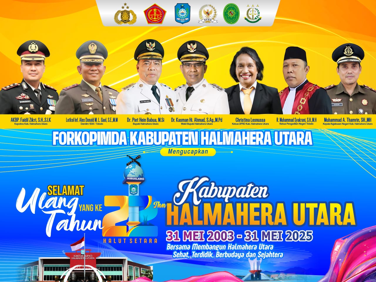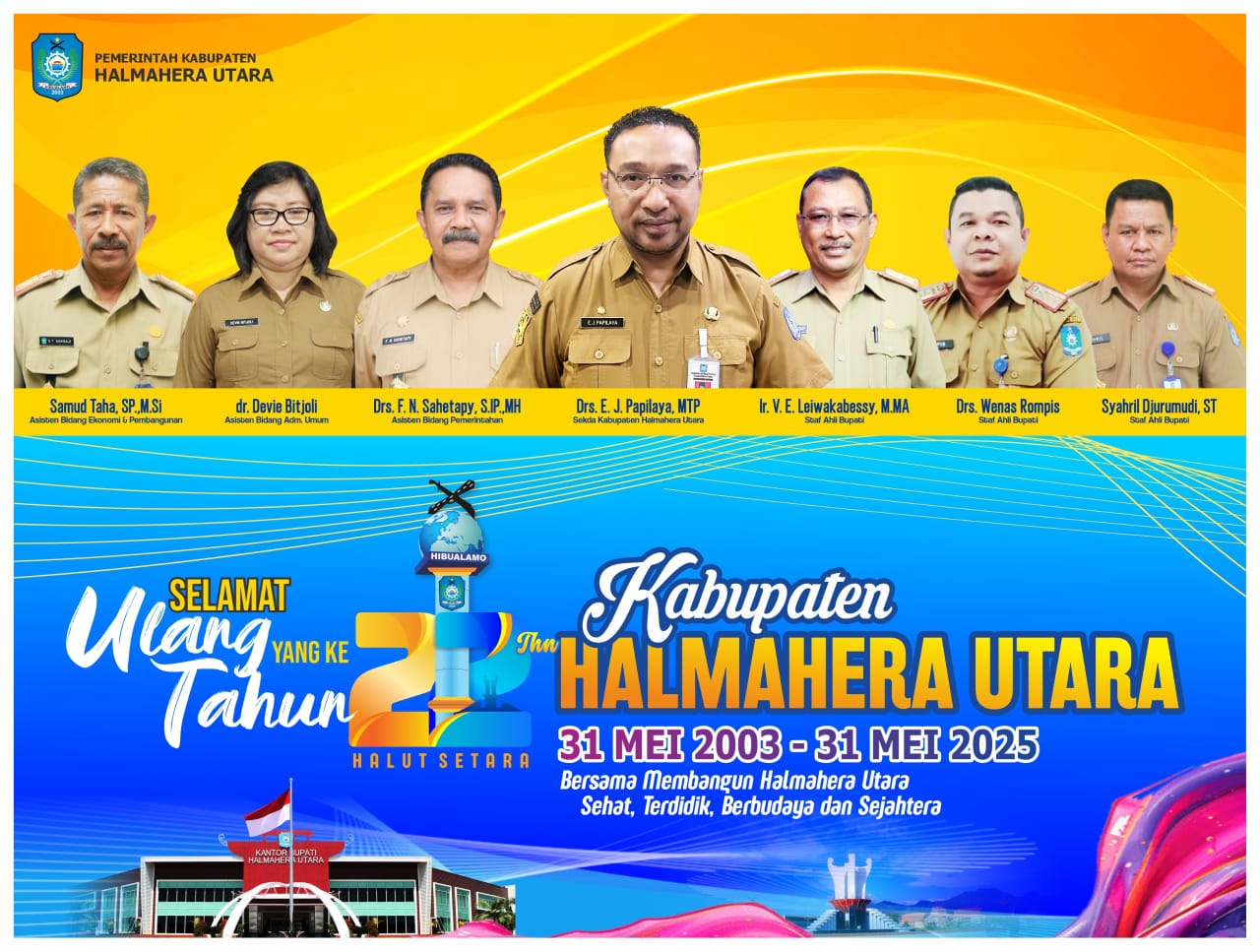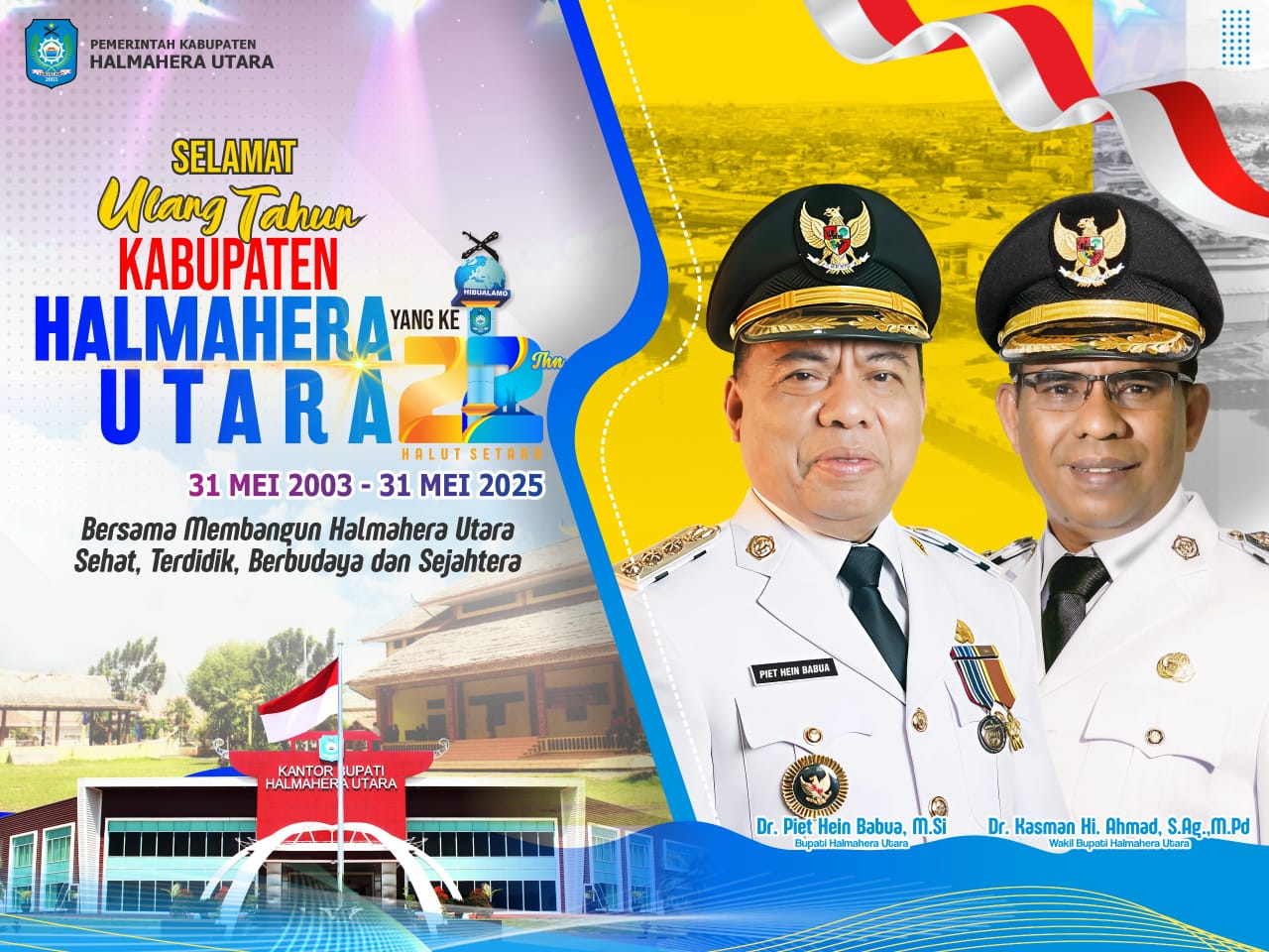 Selamat Ulang Tahun Ke-22 Kabupaten Halmahera Utara. Bersama Membangun Halmahera Utara Sehat, Terdidik, Berbudaya dan Sejahtera