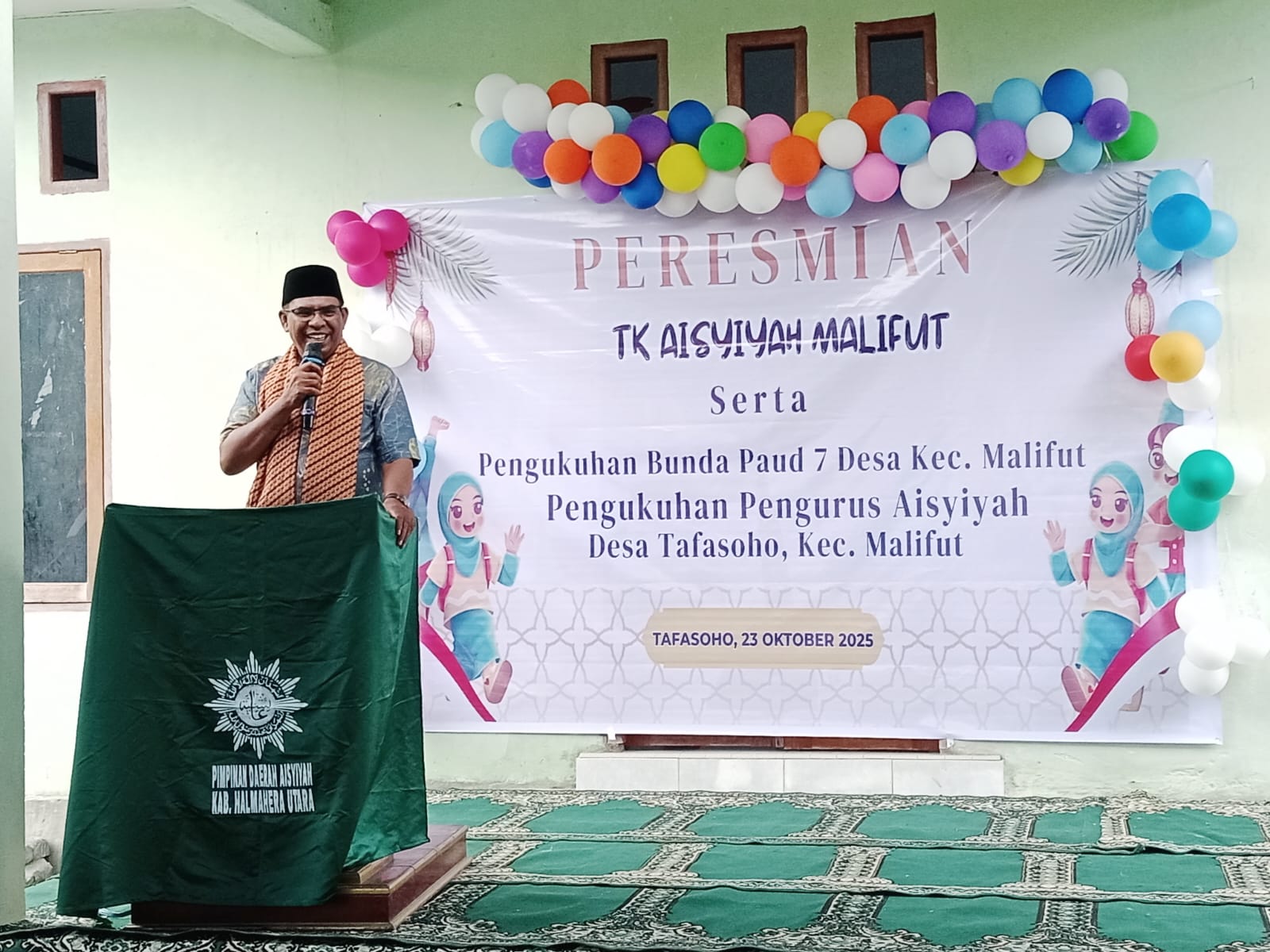 DISKOMINFOSAN - Wakil Bupati Halmahera Utara Dr.Kasman Hi.Ahmad, S.Ag., M.Pd, menghadiri peresmian TK Aisyiyah Malifut ,pengukuhan Bunda PAUD 7 desa kecamatan Malifut serta pengukuhan pengurus Aisyiyah,yang bertempat di desa Tafasoho kecamatan Malifut Halmahera Utara. Jumat 24 Oktober 2025.