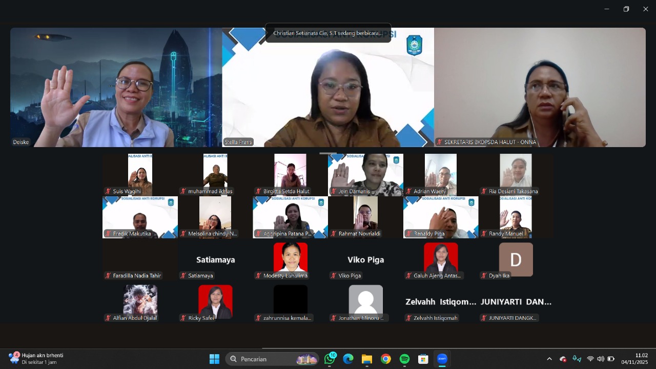 DISKOMINFOSAN. Pemerintah Kabupaten Halmahera Utara, Inspektorat Daerah menggelar Sosialisasi Anti Korupsi bagi Calon Pegawai Negeri Sipil (CPNS) Formasi Tahun 2025, yang dilaksanakan secara virtual melalui Zoom Meeting pada Senin (4/11).
