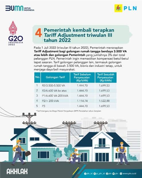 Maka PT PLN (Persero) siap melaksanakan keputusan Pemerintah yang menyesuaikan tarif tenaga listrik (tarif adjustment) kepada pelanggan rumah tangga mampu nonsubsidi golongan 3.500 Volt Ampere (VA) ke atas (R2 dan R3) dan golongan pemerintah (P1,P2 dan P3) mulai 1 Juli 2022. Tarif Penyesuaian terlampir.