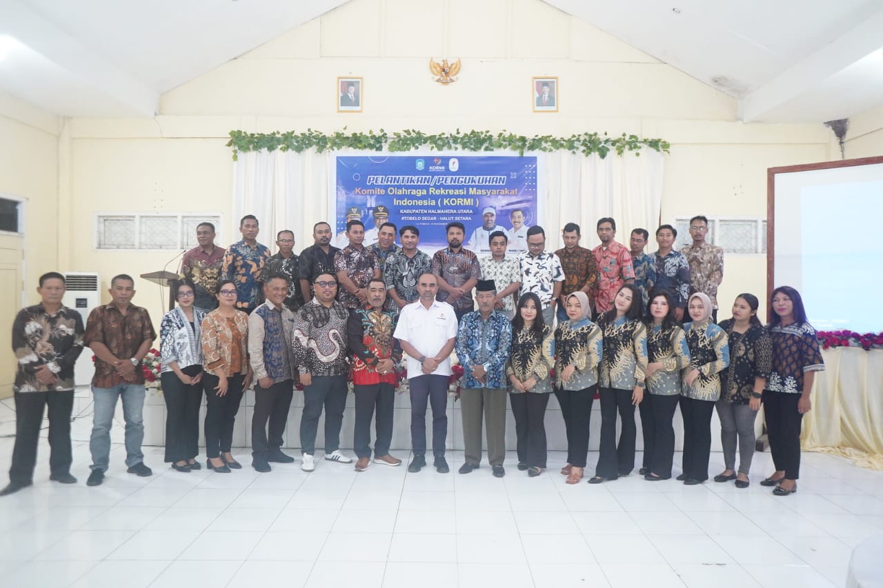 DISKOMINFOSAN – Komite Olahraga Rekreasi Masyarakat Indonesia (KORMI) Kabupaten Halmahera Utara resmi dikukuhkan dalam sebuah upacara pelantikan yang berlangsung meriah di aula Kantor Badan Perencanaan Pembangunan Daerah ( Bappeda),jalan Kawasan Pemerintahan desa Gamsungi Tobelo.Selasa 18 November 2025.