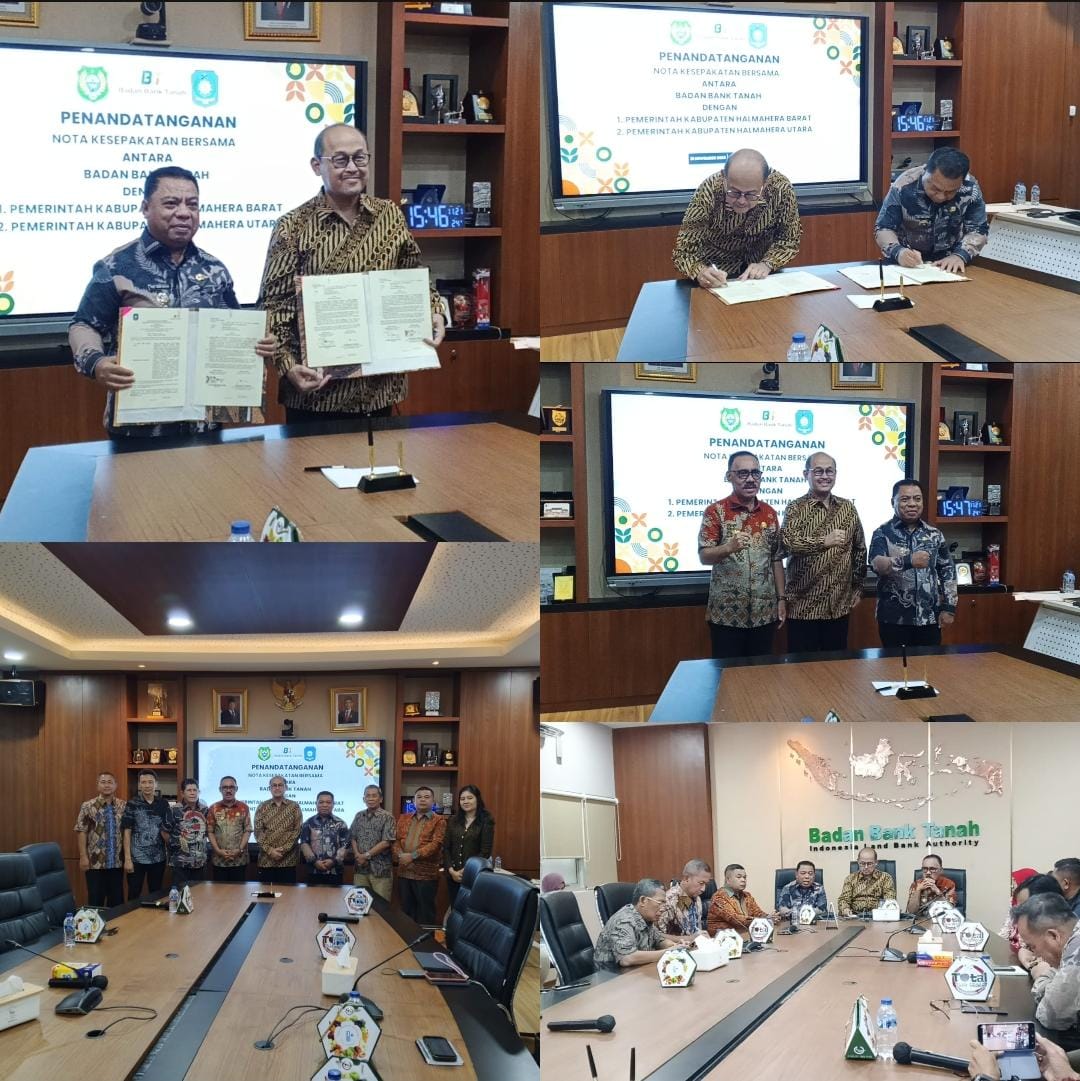 DISKOMINFOSAN - Bupati Halmahera Utara Dr. Piet Hein Babua, M.Si.,atas nama pemerintah kabupaten Halmahera Utara (Halut) menandatangani nota kesepakatan bersama atau MoU dengan Badan Bank Tanah. Penandatanganan nota perjanjian tersebut digelar di gedung kantor Kementerian Agraria dan Tata Ruang/ Badan Pertanahan Nasional Lantai 1, jalan Agus Salim nomor 58,Menteng Jakarta Pusat. Jumat 21 November 2025.