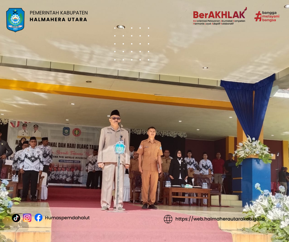 DISKOMINFO. Pemerintah Kabupaten Halmahera Utara menggelar Upacara Peringatan Hari Guru Nasional (HGN) dan Hari Ulang Tahun Persatuan Guru Republik Indonesia (PGRI) ke-80 Tahun 2025, yang dilaksanakan di Lapangan Upacara Pemda Halut (25/11).