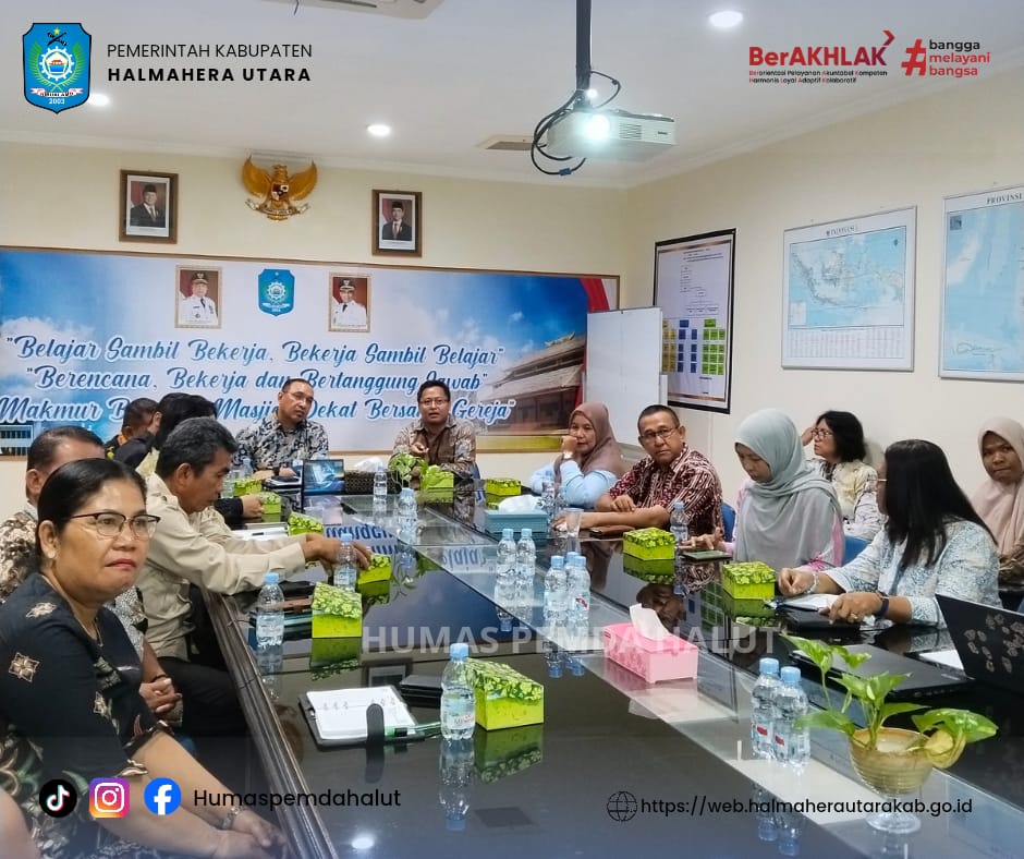 DISKOMINFO. Rapat Monitoring Evaluasi (Monev) Tim Koordinasi Pembinaan dan Pengawasan Obat dan Makanan di Kabupaten Halmahera Utara dibuka oleh Sekretaris Daerah, E.J. Papilaya MTP, yang didampingi oleh Asisten 1 Bidang Pemerintahan, FN Sahetapy, Asisten II Bidang Administarasi umum, Devie C. Bitjoli, Kepala Loka POM di Kab. Pulau Morotai, Salman Fariesy, S.Farm.,Apt. dan tim serta OPD terkait, (18/25).