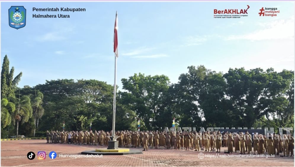 DISKOMINFO. Apel Pagi bersama Aparatur Sipil Negara (ASN) lingkup Pemda Halut pada bertempat di Halaman Kantor Bupati Halmahera Utara, pukul 08.00 WIT. Senin, 26 Januari 2026. Apel pagi dipimpin oleh Sekertaris Daerah Halmahera Utara selaku Inspektur Upacara Kegiatan ini diikuti oleh para Asisten, Staf Ahli Bupati (SAB), para Pimpinan Organisasi Perangkat Daerah (OPD), para Kepala Bagian Setda, serta seluruh staf lingkup Pemerintah Kabupaten Halmahera Utara.