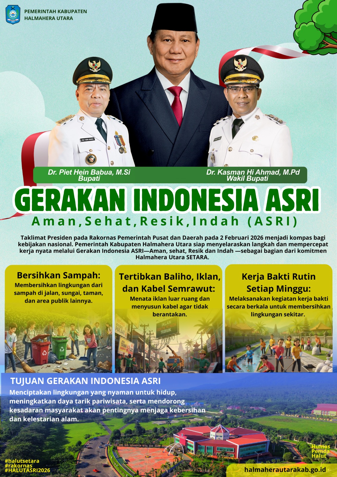 Taklimat Presiden pada Rakornas Pemerintah Pusat dan Daerah pada 2 Februari 2026 menjadi kompas bagi kebijakan nasional. Pemerintah Kabupaten Halmahera Utara siap menyelaraskan langkah dan mempercepat kerja nyata melalui Gerakan Indonesia ASRI—Aman, sehat, Resik dan Indah —sebagai bagian dari komitmen Halmahera Utara SETARA.