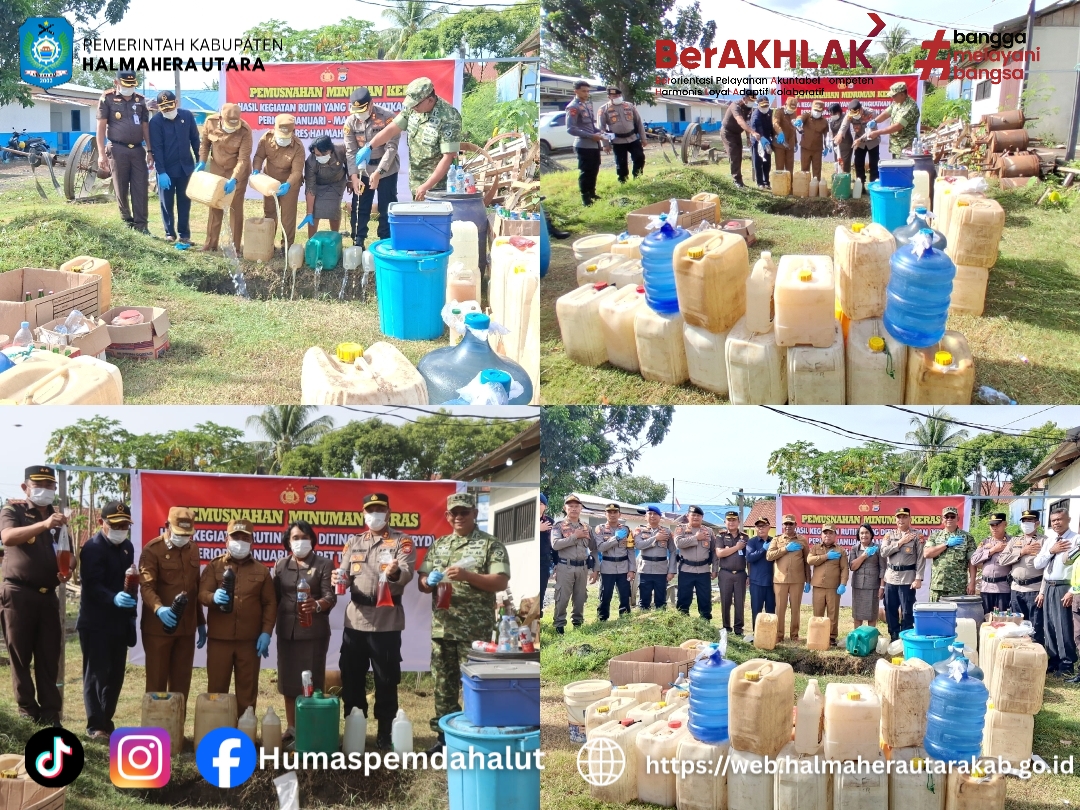 Bupati bersama pimpinan Forkopimda Halmahera Utara melakukan pemusnahan barang bukti minuman keras dengan jumlah yaitu cap tikus sebanyak 4.977,3 Liter, ciu sebanyak 85,6 Liter, tuak sebanyak 600 Liter, miras oplosan sebanyak 200 Liter, miras berbagai merk sebanyak 145 botol,bir hitam sebanyak 20 botol,bir putih sebanyak 10 botol. Total 5,862,9 Liter dan 176 Botol.(Humas 2).