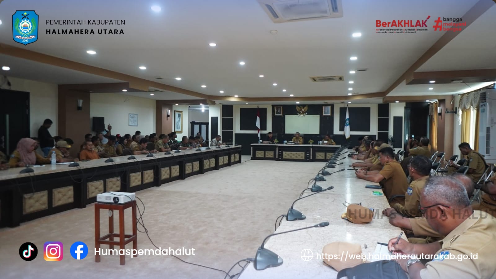DISKOMINFOSAN. Bertempat di ruang pertemuan Fredy Tjandua lantai II Kantor Bupati Halmahera Utara (28/4) Pemda Halut menggelar rapat yang dipimpin oleh Sekretaris Daerah E.J Papilaya didampingi Asisten I, F,N Sahetapy. Hadir dalam rapat yang membahas terkait dengan ketentraman dan ketertiban serta keamanan dan penataan kegiatan/acara keramaian dalam masyarakat, yaitu: Forkopimda, Kaban Kesbangpol, Kadis PMD, Kasatpol PP, Kadis Kominfo, Para Camat-se kab. Halut dan para Kades-Se-Halmahera Utara.