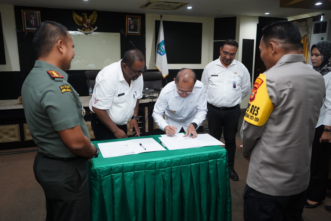 Diskominfosan – Pemerintah Kabupaten Halmahera Utara melakukan penandatanganan Naskah Perjanjian Hibah Daerah (NPHD) dalam rangka pelaksanaan Pemilukada serentak Tahun 2024 Antara TNI/POLRI, KPU dan Bawaslu Ruang Meeting Fredy Tjandua, kantor Bupati Halmahera Utara, Rabu (06/12/2023).