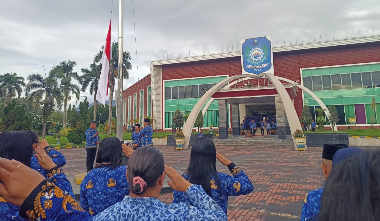 DISKOMINFOSAN. Bertempat di lapangan upacara Kantor Bupati Halmahera Utara, dilaksanakan Upacara Peningkatan Prestasi Kerja (17/7). Sekretaris Daerah, Drs E. J Papilaya, MTP bertindak sebagai Inspektur Upacara, dan dihari oleh Pimpinan OPD serta ASN lingkup Pemda Halut.