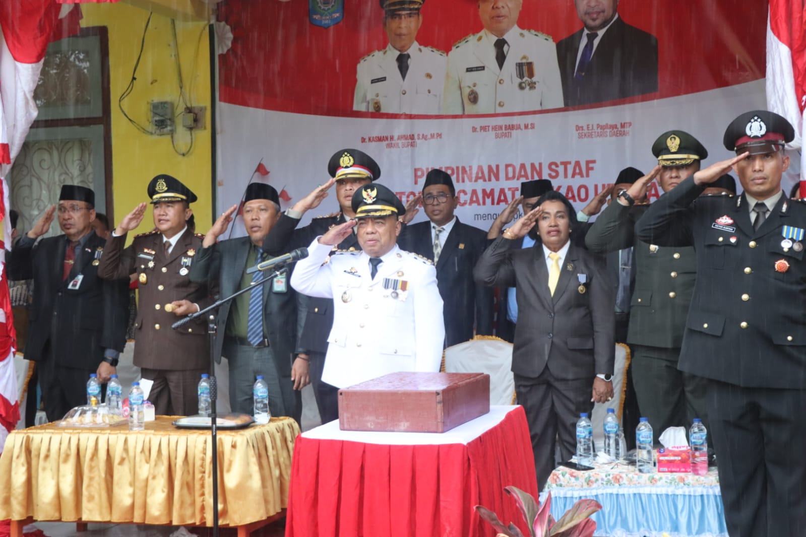 Upacara penurunan bendera berlangsung khidmat di tengah turunnya hujan, tetapi para peserta upacara tetap bersemangat dengan kehadiran orang nomor satu di kabupaten Halmahera Utara.
