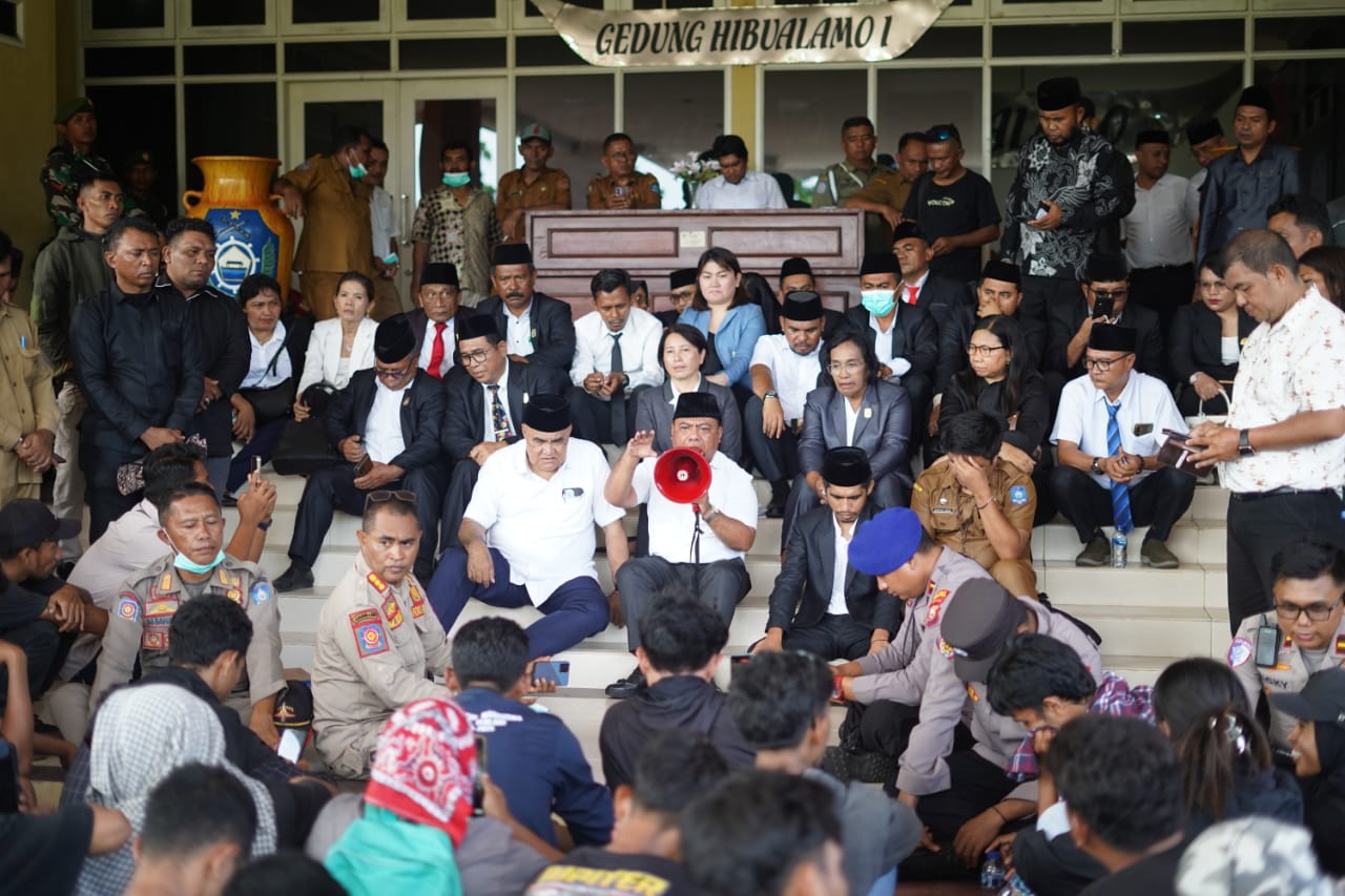 DISKOMINFOSAN - Aksi unjuk rasa oleh Aliansi Mahasiswa Halmahera Utara (AMARAH) di depan Kantor DPRD yang bertepatan dengan Rapat Paripurna Rancangan Perubahan APBD 2025 oleh DPRD Halmahera Utara, Bupati Piet Hein Babua dan Anggota DPRD langsung temui massa aksi, dan duduk beralaskan lantai melakukan dialog, Selasa 2 September 2025.
