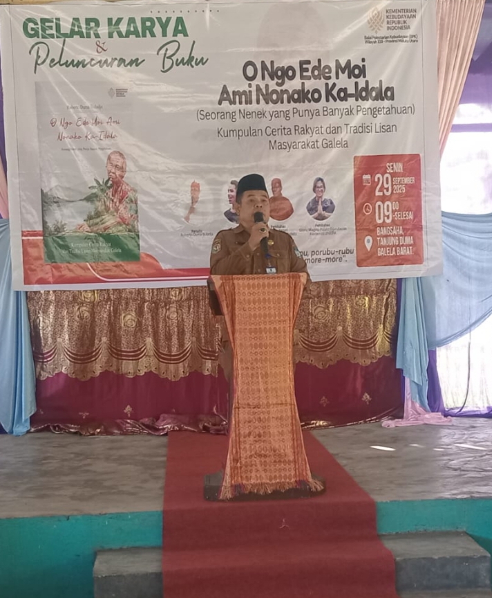 DISKOMINFOSAN- Staf Ahli Bupati Bidang Sumber Daya Manusia ( SDM), Pendidikan dan Kemasyarakatan Setda Halmahera Utara Drs. Wenas Rompis hadiri Gelar Karya Dan Peluncuran Buku O Ngo Ede Moi Ami Monako La-Idola. Kegiatan ini bertujuan untuk memperkuat tradisional literasi dan mengangkat kearifan lokal masyarakat Galela.Bertempat di Bangsaha, Tanjung Duma Galela Barat Halmahera Utara. Senin 29 September 2025.