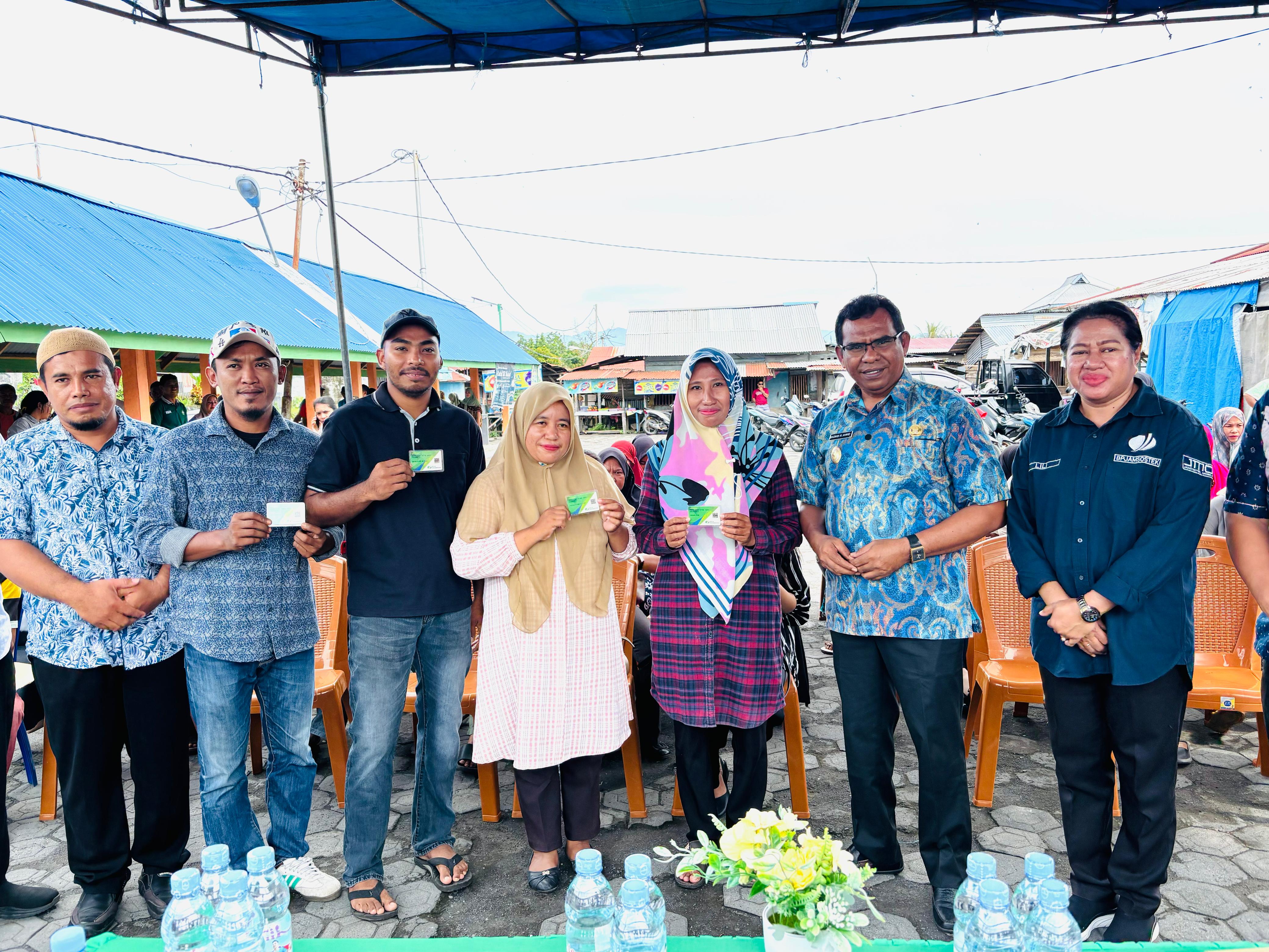 DISKOMINFOSAN - Wakil Bupati Halmahera Utara, Dr. Kasman Hi. Ahmad, M.Pd, menghadiri kegiatan Sosialisasi BPJS Ketenagakerjaan, Penyerahan Kartu BPJS, serta Santunan Jaminan Kematian dan Hari Tua. Bertempat di Pasar Soa Sio, Kecamatan Galela Halmahera Utara. Kamis 9 Oktober 2025.